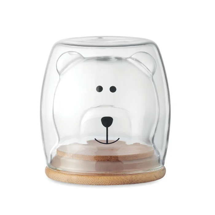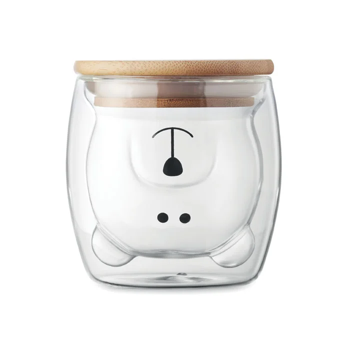 Кружка с двойными стенками из боросиликатного стекла с забавной медвежьей мордочкой и бамбуковой крышкой. Объем: 260 мл.