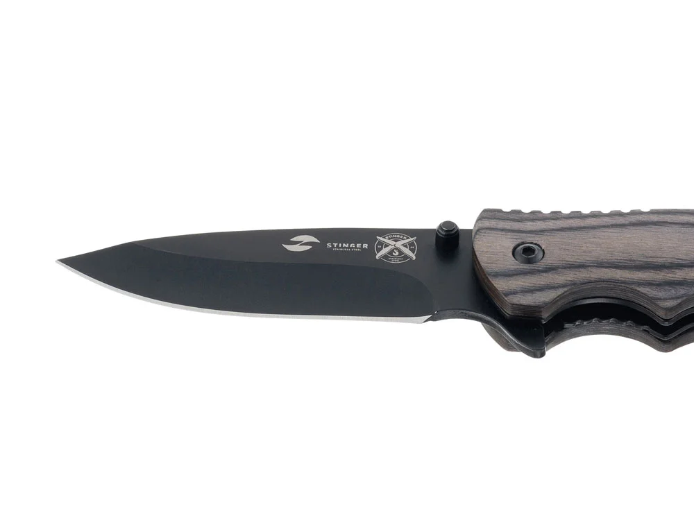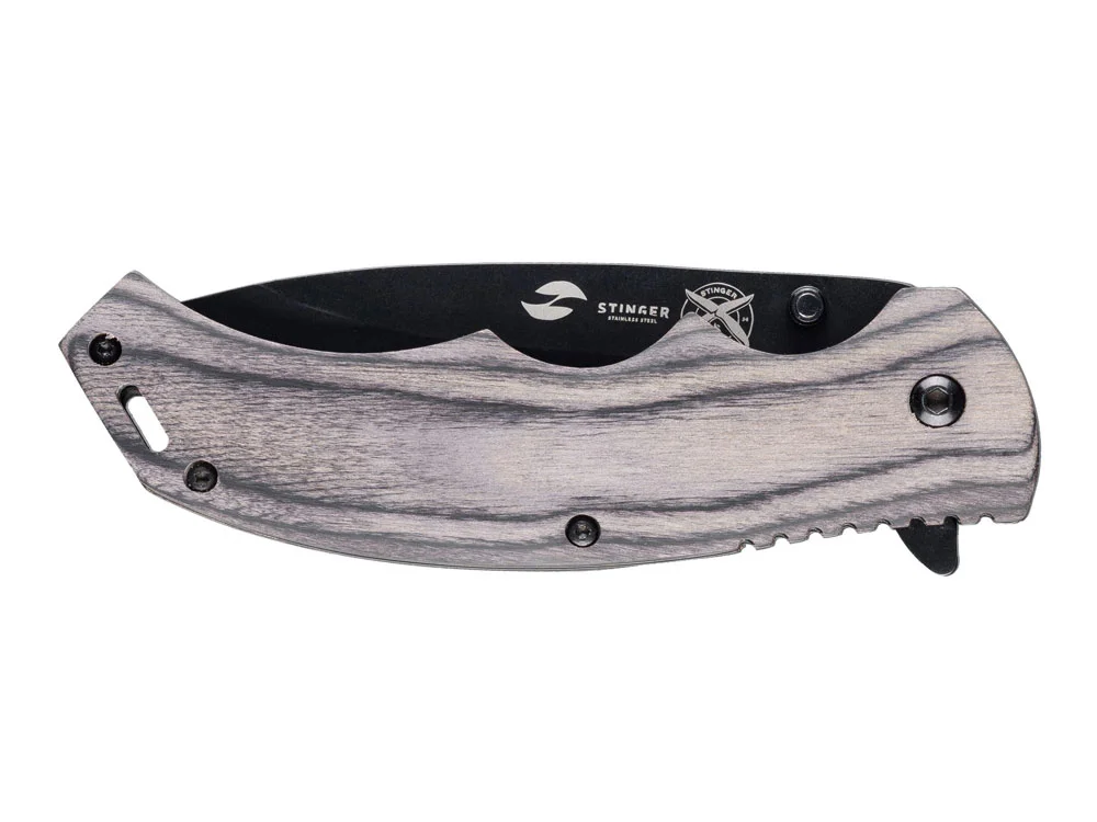 Нож складной Stinger, 120 мм, (чёрный), материал рукояти: дерево/сталь (серый), в картонной коробке