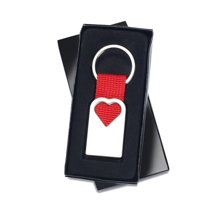 Металлический брелок для ключей с прорезью в виде сердечка и красным текстильным ремешком.